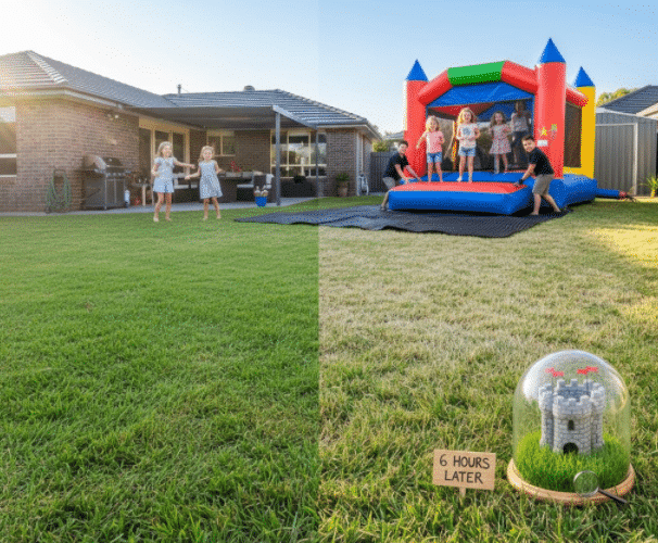 1. Blade Compression: Grass is surprisingly resilient, but 6 hours of heavy weight (plus kids jumping) forces the air out of the blades. They lose their “spring” and lay flat.